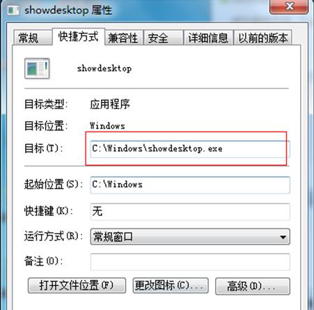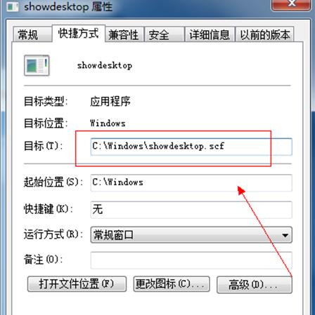 4、再次到C:\windows目錄下,找到剛保存的文件,將showdesktop.exe文件的后綴改為scf,也就是Showdesktop.scf,改完之后,將拖到任務(wù)欄中showdesktop.exe右擊選擇屬性,在打開(kāi)的屬性窗口中,更改目標(biāo)這一欄的文件名,默認(rèn)如圖所示:
