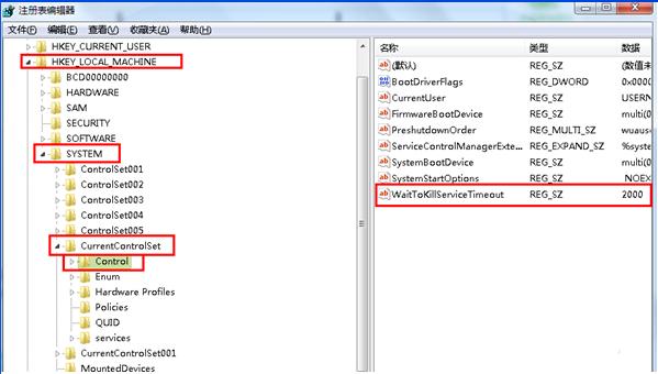 2、進(jìn)入注冊(cè)表,定位到:HKEY_LOCAL_MACHINE/SYSTEM/CurrentControlSet/Control。然后找到waitToKillServiceTimeout。
