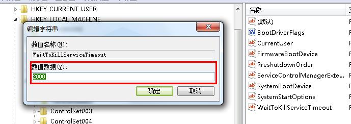 3、點(diǎn)擊 “control”這個(gè)文件夾,彈出編輯字符串waitToKillServiceTimeout,如果數(shù)值是12000,建議改成2000.這樣關(guān)機(jī)的時(shí)間就縮短了!點(diǎn)擊“確定”即可。