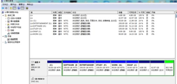 1. 右擊“計(jì)算機(jī)”選擇“管理”,出現(xiàn)“計(jì)算機(jī)管理”界面, 點(diǎn)擊右邊欄中的“磁盤管理”,出現(xiàn)如下圖界面。