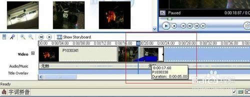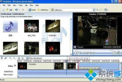 4、用滑鼠指在照片或短片的末端,就會出現(click and drag to trim the clip) 那就是說,可以把那一張照片的播放時間放長或拉短。
